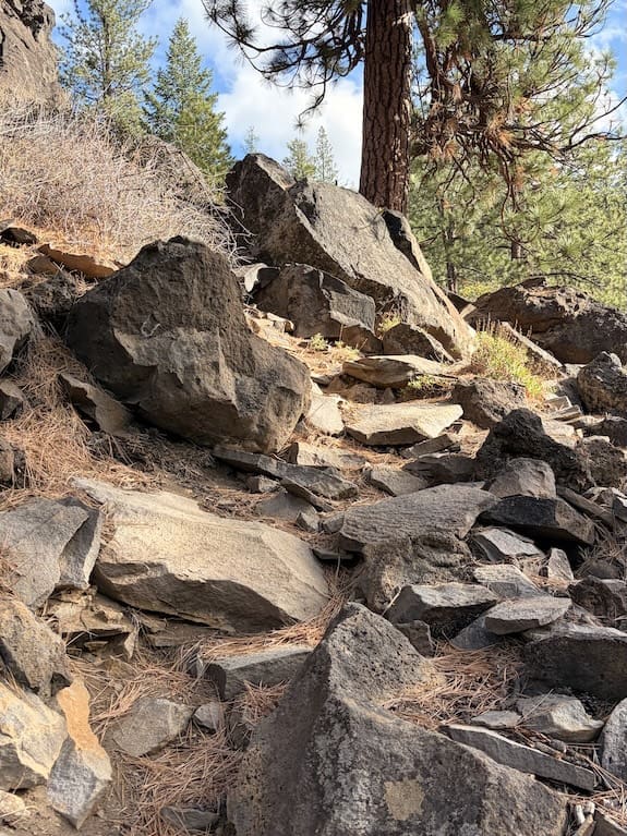 After following the noisy little stream for a ways, the trail veers upward over boulders where the path isn’t always obvious. (I may or may not have led us off the main route to a drop-off once.)